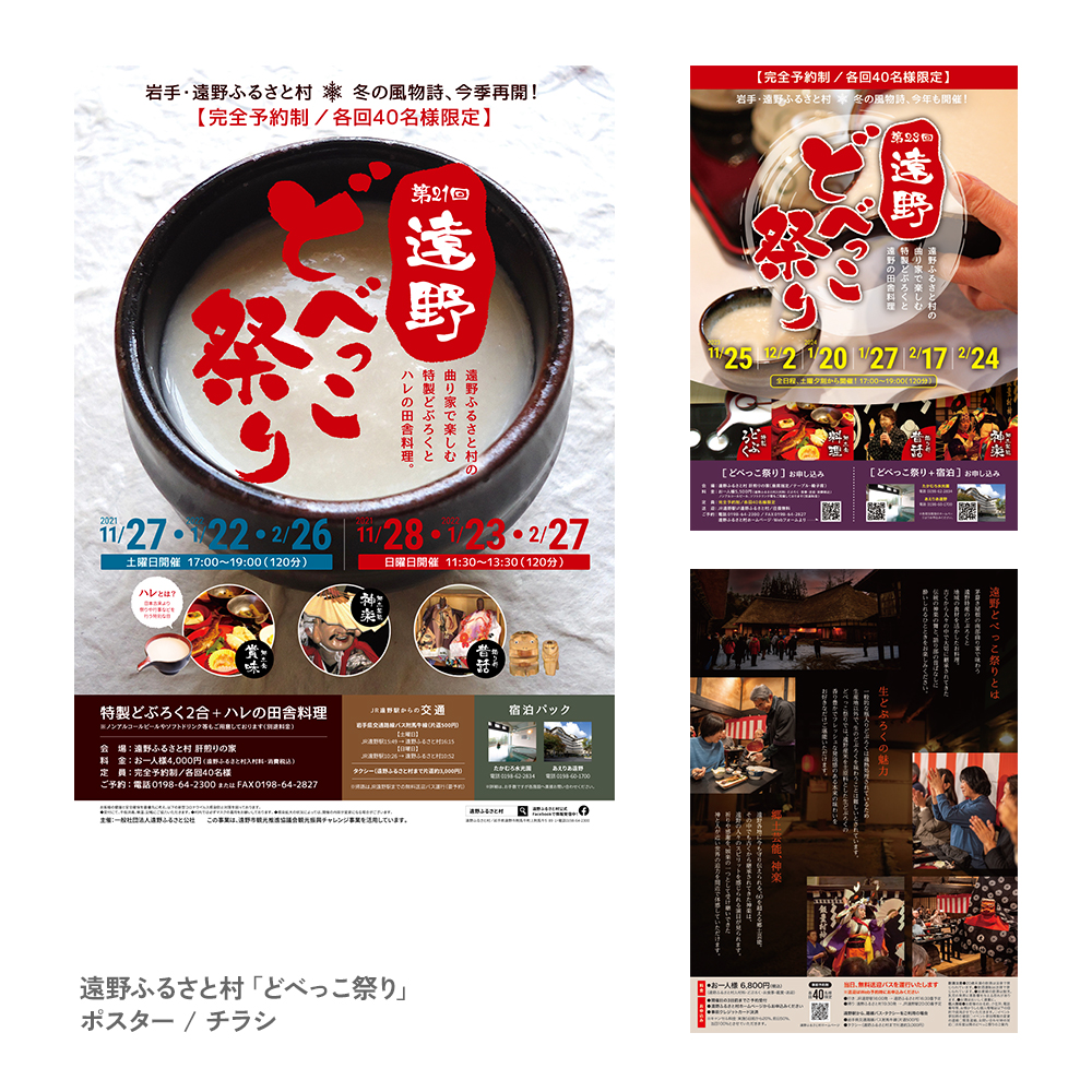 遠野ふるさと村で毎年開催されているイベントのポスター・チラシを2021年から制作。“日本のふるさと遠野” の冬の風物詩を県内外へPRするツールとして、観光案内所や駅などに配布され活用されています。