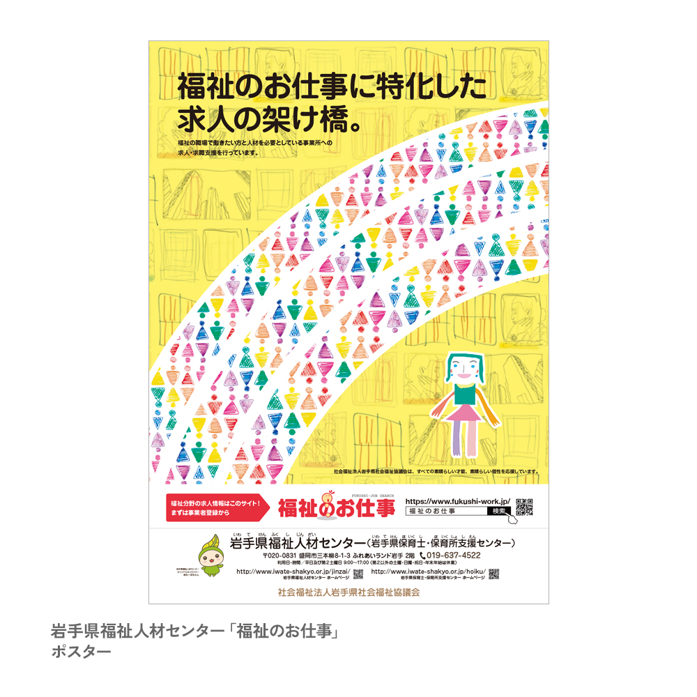 福祉の現場と求職者をつなぐWEBサイトの案内ポスターをデザインしました。障がいのある人が描いた図柄で作成したパブリックデータを使用。共生社会の実現に向けたアクションへの訴求メッセージが高まりました。