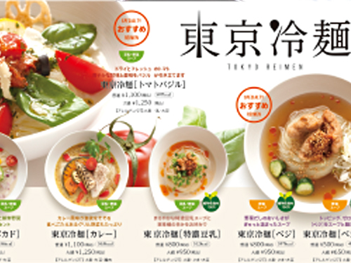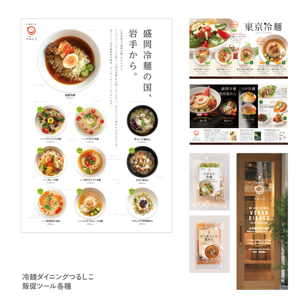 2017年に東京にオープンした冷麺専門店の販促ツールです。多彩なアレンジやヴィーガン対応など新しい冷麺スタイルに合わせ、ヘルシーなイメージで展開。ターゲットである女性客の集客につながりました。