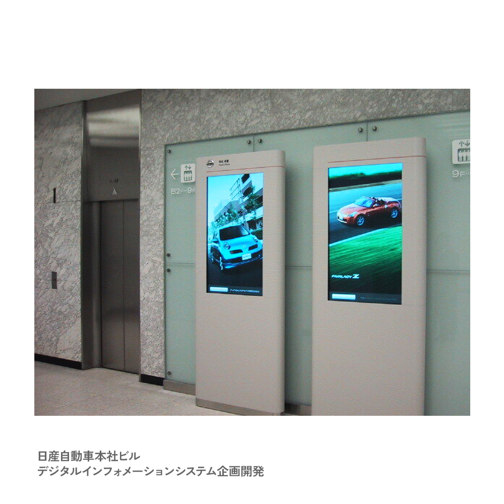 日産自動車本社ビルのエントランスに、タッチ操作が可能なデジタル案内システムを導入。 ドリームラボが企画・開発・設置までを一貫して手がけました。