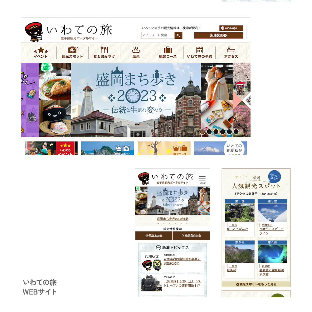 広い岩手県内の膨大な観光情報をデータベースで管理。 スマートフォンでの位置情報検索機能やマイ旅行マップ作成機能なども実装しました。特集ページ制作では、取材から撮影編集までワンストップで行いました。