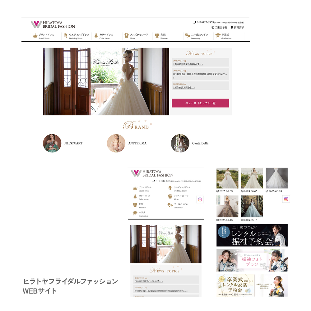 CMSによるサイト更新管理。 来店フォームの種別が多いため、フォーム管理システムも導入。 インスタグラムを埋め込み、最新の投稿が目立つような工夫も施しました。